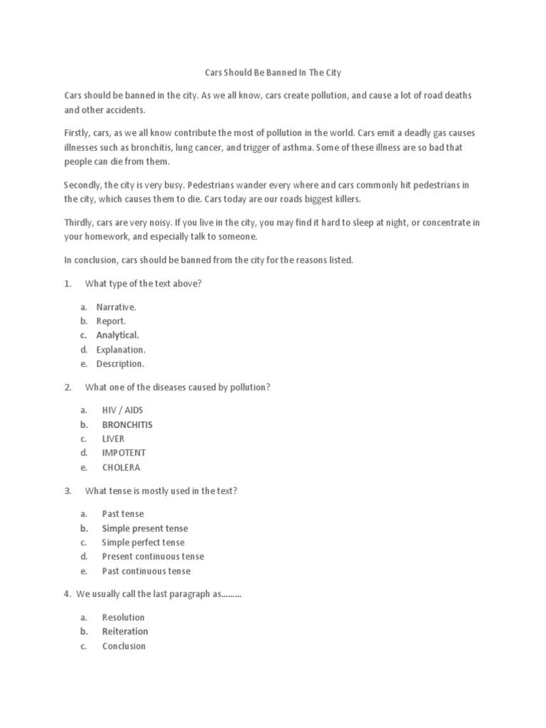 Inggris (analytical text) cars should be banned in the city.